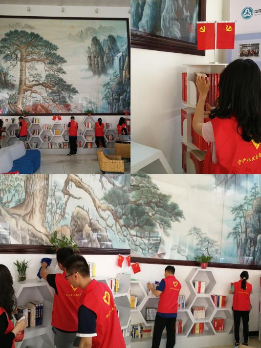 在支部书记赵元超同志的带领下,同志们对化工楼大厅的书架进行了清洁并将书架上的书籍进行分类整理,以便同学们更快找到自己想要的书籍。同时,支部同志对大厅的沙发、桌椅调整摆放,对文化角进行卫生清理,为同学们创造良好的阅读环境,也能更好地对外展示公司形象。