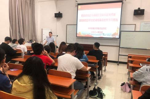 2021年5月26日晚,伟德victor1946官网党委党校常务副董事长、组织部副部长赵永正同志在新校区化学楼128教室为伟德victor1946官网登录本科生化工第一党支部讲授题为“把百年党史和湖南巨变联系起来把握,深刻感悟百年党史湖南篇章的作为与担当”的党史学习教育专题党课。支部全体党员参加学习。