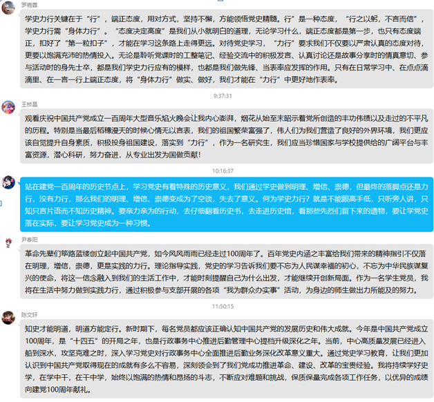 最后,王桢昌同志组织大家开展了“学史力行”专题学习研讨,支部党员尹春阳、罗嘉蓉、陈文轩、王桢昌、范迎杰五位同志围绕党史学习教育分享了个人的学习体会。尹春阳同志表示:理论指导实践,党史的学习告诉我们要不忘为人民谋幸福的初心,不忘为中华民族谋复兴的使命,将这一信念融入到我们的生活工作中,才能时刻提醒自己为什么出发,才能继续开创新局面。作为一名员工党员,我将在生活中努力做到实践力行,通过积极参与支部开展的各项“我为群众办实事”活动,为身边的师生做出力所能及的贡献。罗嘉蓉同志认为:对待党史学习,“力行”要求我们不仅要以严肃认真的态度对待,更要以饱满充沛的热情投入。无论是聆听党课时的工整笔记、经验交流中的积极发言、认真讨论还是故事分享时的情真意切、参与活动时的身先士卒,都是我们学史力行应有的模样,也都是我们做先锋、当表率应发挥的作用。只有在日常学习中、在点点滴滴里、在一言一行上端正态度,将“身体力行”做实、做好,我们才能在“力行”中更好地作表率。