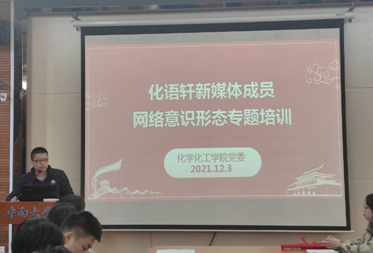 为进一步提升化语轩新媒体成员思想政治素养、强化网络意识形态风险防范能力,12月3日,伟德victor1946官网登录党委在新校区化学楼“初心讲堂”开展化语轩新媒体成员党史学习教育暨网络意识形态工作专题培训活动。培训会由华绪雨老师主持,新媒体中心主任、公司红色宣讲团成员于悦凡老师主讲党史学习教育党课,伟德victor1946官网登录党委委员、专职组织员李璞老师作网络意识形态工作专题培训。全体新媒体成员参会。