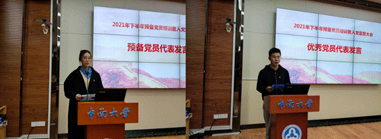 宣誓完毕,预备党员代表梁琦敏发言。她表示,虽然现已在组织上入党,但是作为一名合格的党员还应该做到思想上入党,继续加强党的理论知识学习,不断提升党性修养。随后优秀党员代表李瑞毅同志发言,他分享了自己的入党经历,并表示通过积极参加组织生活和党史学习教育,思想政治觉悟得到不断提升,同时也鼓励大家今后积极履行“我为群众办实事”,在学习生活中践行入党誓词。