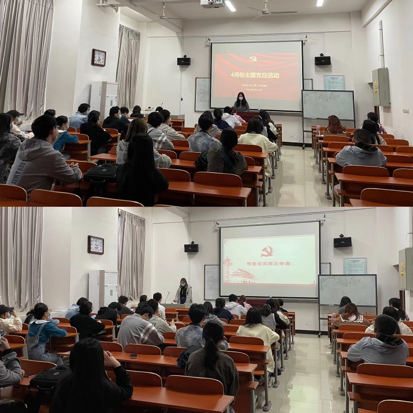4月14日下午,本科生化工第二党支部在化学楼128教室开展4月主题党日活动,支部书记白丹妮同志主持。