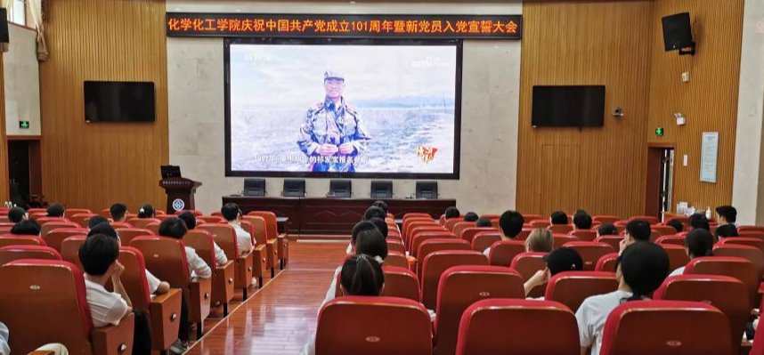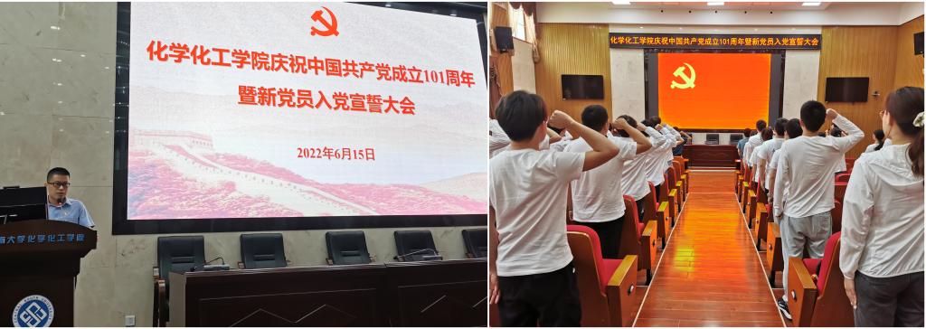 为庆祝建党101周年,同时对新党员进行一次深刻的党性教育,6月15日下午,伟德victor1946官网登录党委在新校区化学楼133报告厅举行庆祝中国共产党成立101周年暨新党员入党宣誓大会。伟德victor1946官网登录党委书记罗永忠出席并作主题讲话,党委副书记刘有才、学工办主任滕晓雯、学工办副主任白丹妮、党委宣传干事汪菁垚、优秀党员代表梅梅以及2022年上半年新接收的预备党员参加会议。伟德victor1946官网登录党委委员、专职组织员李璞主持大会。