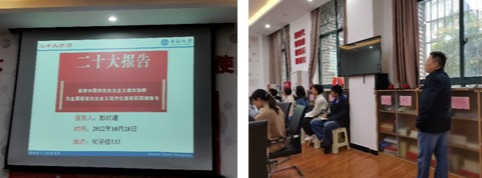 2022年10月28日,硕士生有机第一、第二党支部联合开展10月份主题党日活动,邀请联系支部的教职工党支部书记彭红建老师为支部全体党员讲授党的二十大精神专题党课。