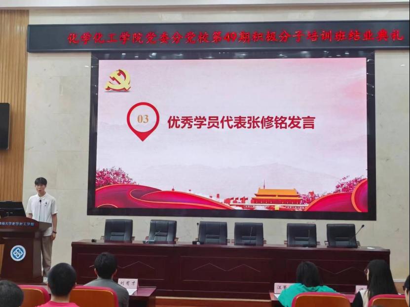 随后,优秀学员代表张修铭发言。他结合自身学习生活分享了培训期间的心得体会以及思想进步的历程:在这次培训中,能够收获许多宝贵的知识和深刻的感悟。通过系统的学习,学员们对党的历史、党的宗旨、党的理论有了更加深入的理解和认识。每一次的课程都像是一次思想的洗礼,让大家更加坚定了向党组织靠拢的决心。在日常的学习生活中,也要时刻以党员的标准要求自己,积极参与各项活动,努力提升自己的综合素质。正如他所言:“我深知,成为一名合格的党员还有很长的路要走,但我们应当坚持不懈地努力下去,不断追求进步,为党的事业贡献自己的力量。”