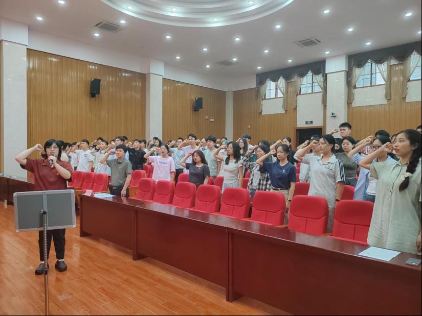 大会开始,所有参会成员共唱《国际歌》,随后谭澳利宣读新接收的64名预备党员名单。宣读完名单后由汪菁垚领誓,全体预备党员面向党旗进行入党宣誓。