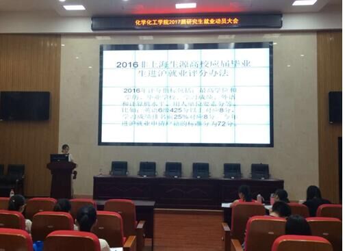 又到了秋风送爽的季节,天气虽不如夏季那么炎热,秋季招聘的热潮却是一波接着一波。2017届毕业生迎来了就业季,他们早已蓄势待发,踌躇满志。为引导毕业生树立正确的择业观,提高毕业生就业的积极性和主动性,促进毕业生顺利就业,2016年9月27日下午,公司在新校区化学楼133报告厅召开了2017届研究生就业动员大会。大会由就业指导中心的张忆荣老师主讲,出席本次动员大会的有公司学工办主任滕晓雯老师、研究生辅导员杨娟老师以及2014级全体研究生。