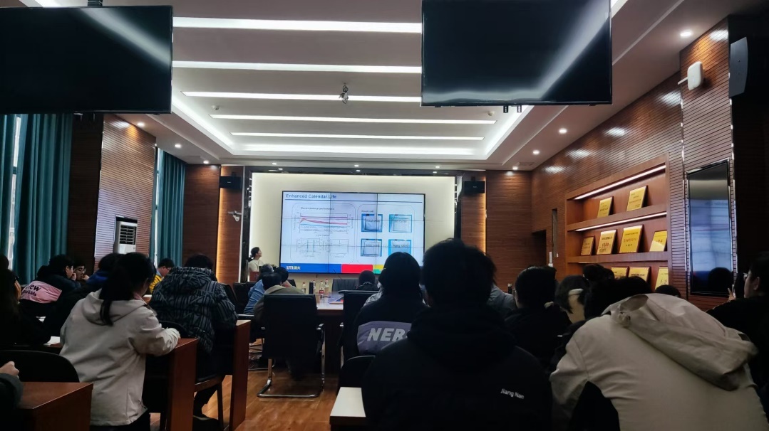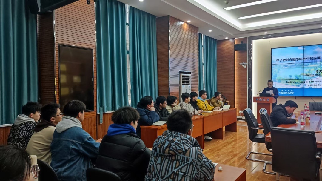 讲座接近尾声,各位教授和现场聆听的老师和员工进行了精彩的互动。李海峰教授对中子散射技术在电池研究中的应用向同学们作了详细介绍:
