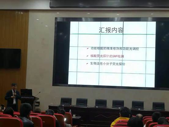 报告会上,汤教授首先简要介绍了其课题组的研究兴趣所在以及核酸药物研究的问题和挑战,然后分别从端基修饰功能核酸的光调控、环状功能核酸的功能调控、功能核酸的纳米自组装及功能调控、基于RNase L的反义核酸药物的研究四个方面进行讲解。之后,汤教授讲述了vitE修饰siRNA的构建和作用机制,cRGD修饰siRNA及Caged crRNA对不同基因表达的调控,光敏感、非光敏感的环状siRNA,肿瘤靶向拉曼探针、生物正交SERS纳米探针的构建和应用、核酸荧光探针的SNP检测和生物活性小分子荧光探针等内容。