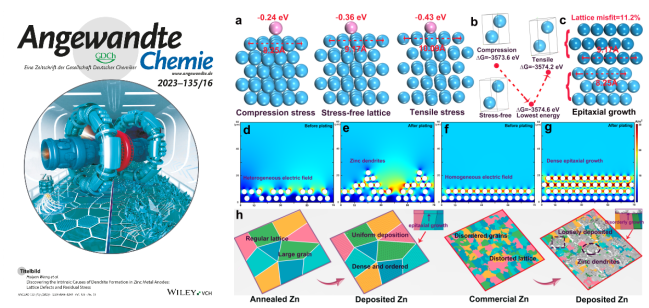 近日,公司伟德victor1946官网登录唐有根-王海燕教授团队在金属能源界面化学调控的最新研究成果以封面文章发表在化学类国际顶级期刊Angew. Chem. Int. Ed.(2023, DOI:10.1002/anie.202218612),并被选为热点文章,论文题目为“Discovering the Intrinsic Causes of Dendrite Formation in Zinc Metal Anodes: Lattice Defects and Residual Stress”。伟德victor1946官网为唯一通讯单位,王海燕教授为通讯联系人,2022级博士生谢春霖为第一作者。