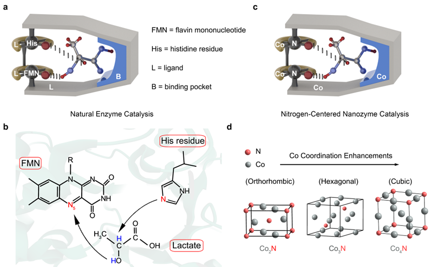 设计能与天然酶匹配的纳米酶一直是一个有吸引力和挑战性的目标,经典的碳负载金属x-Ny(MxNy)催化剂表现出理想的类酶催化性能,其中非金属N原子通常作为配体来调控金属中心的电荷密度以模拟类似于天然金属酶的活性位点,例如M−N2、M−N3和M−N4。这种设计策略不适用于乳酸氧化酶等黄素酶,其非金属N的强电负性对于乳酸的α-C-sp(3)-H键氧化为丙酮酸至关重要。然而,乳酸的高C-H键能使得传统化学催化剂催化乳酸不可避免地在高温(通常超过200oC)或高压(例如超过1 MPa)下才能氧化脱氢生成丙酮酸。因此,乳酸作为恶性肿瘤中的重要信号代谢物,其通过模拟酶的方式进行催化转化,目前尚未能实现。针对这一问题,研究团队通过控制金属的数量来调节N的配位层,以操纵N中心周围的配位场和电子结构(M2-N、M3-N、M4-N,M=Co原子),开发了一种基于Co4N/C的乳酸氧化酶纳米酶,实现了常温常压下催化乳酸氧化为丙酮酸。与Co2N和Co3N相比,Co4N在富电子的N原子周围形成了最协调的电子构型,促进了对乳酸底物的识别和中间体的电荷中和,从而实现了对乳酸α-C−H和α-C−OH质子的高效提取,并将其应用于重构肿瘤的高乳酸微环境以激活抗肿瘤免疫及抑制淋巴结肿瘤转移。