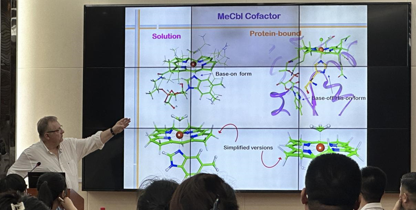 Kozlowski教授的报告题目是“Quantum Chemical Modeling of Co-C Bond Activation in B12-Dependent Enzymes”。报告伊始,教授热情介绍了自己的公司路易斯维尔大学以及所在的肯塔基州的风土人情,从而引出Kozlowski教授的主要研究方向:维生素B12即氰钴胺素(CNCbl),以及它的两种生物活性衍生物(AdoCbl、MeCbl)。教授详细讲述了它们的发现和相关研究进程,简单表述了对应的化学结构,并提出当下对其功能的研究依然存在疑点。接下来教授按照顺序,细致地分析了MeCbl和AdoCbl/B12辅因子,辅因子(cofactor)是酶促反应中不可或缺的一部分。辅因子可以是有机或无机物质,它们与酶蛋白结合,共同参与化学反应的催化过程。随后,基于当下仍面临的困难:AdoCbl-Dependent Mutases的一般催化途径的初始步骤仍不清楚、B12-Dependent酶催化的关键问题和活性位点络氨酸基序对B12催化作用的影响等,教授展开了一系列启发性的探讨。最后通过讲述B12在光催化领域的研究进展,解释了现阶段的研究重心是围绕着B12依赖酶的催化机制展开的。由此可见,在B12的光催化领域,教授有着自己独到的见解以及雄厚的理论背景。