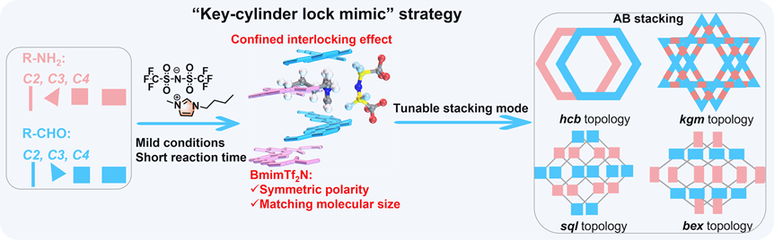 大多数二维共价有机多孔聚合物(2D COFs)由非共价堆叠的薄片组成,2D COFs的固有性质除了与化学性质有关外,还与它们堆积行为密切相关。目前,大多数2D COFs采用AA堆积模式,极少数情况下采用交错(AB或ABC)堆积。部分文献报道加入特定客体等策略可以实现交错AB堆积,但调控手段有限,而且COFs合成条件较为苛刻,除反应时间长外还需要高温密封等条件。因此,开发简单通用并且可精准地调节2D COFs堆积模式的方法仍是一个巨大的挑战。本文从“钥匙-筒锁”系统的操作机制中获得灵感,设想使用ILs来调控2D COFs的堆积模式。