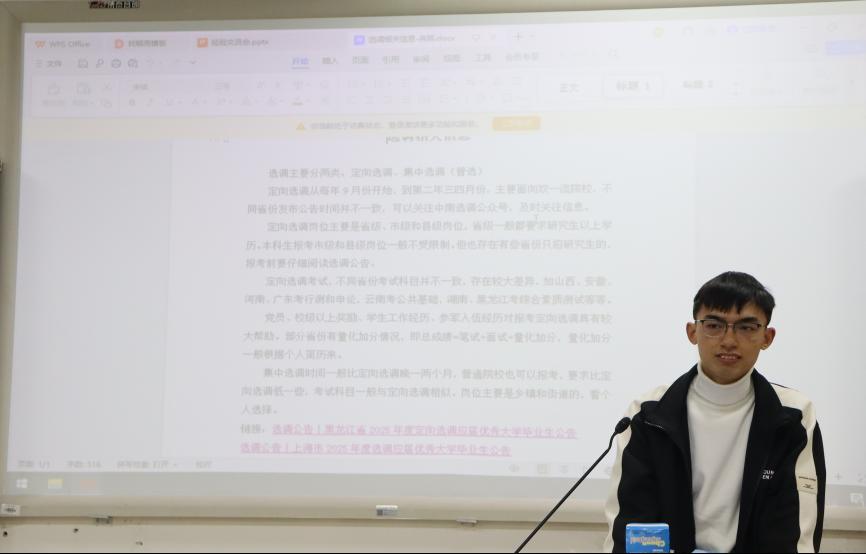活动伊始,由主持人总体介绍各位毕业生党员基本情况,增进大家之间的了解,而后2023级同学据此进行提问,毕业生党员也给予了积极回应。冉照同志结合各省选调公告就选调的分类,定向选调的岗位及如何准备选调生考试进行了分享,提醒同学们根据自身意愿报考情况早做准备。