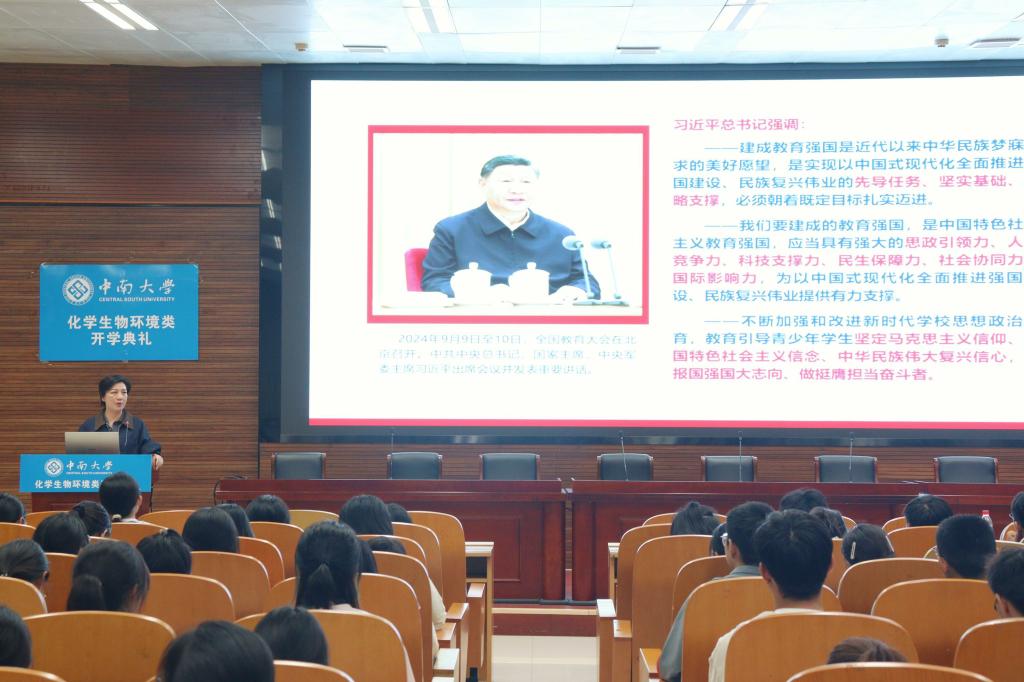 随后,滕晓雯老师以陈新民、黄伯云、王传福、梁稳根等中南优秀前辈的奋斗事迹为例,鼓励同学们见贤思齐,学习前辈们勇于担当奋斗的精神,继承中南人“经世致用,坚毅笃行”的优良传统,将爱国情、强国志、报国行融入学业发展与人生规划中,在新时代征程中书写璀璨的青春篇章。