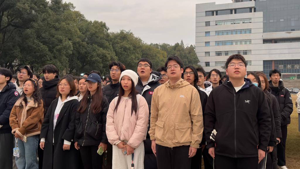 晨光熹微,寒意微凛,全体师生在图书馆前整齐列队。6点40分,仪式正式开始。国旗护卫队的同学们迈着铿锵有力、整齐划一的步伐,护卫着鲜艳的五星红旗走向升旗台。全场师生肃立,目光紧随国旗。