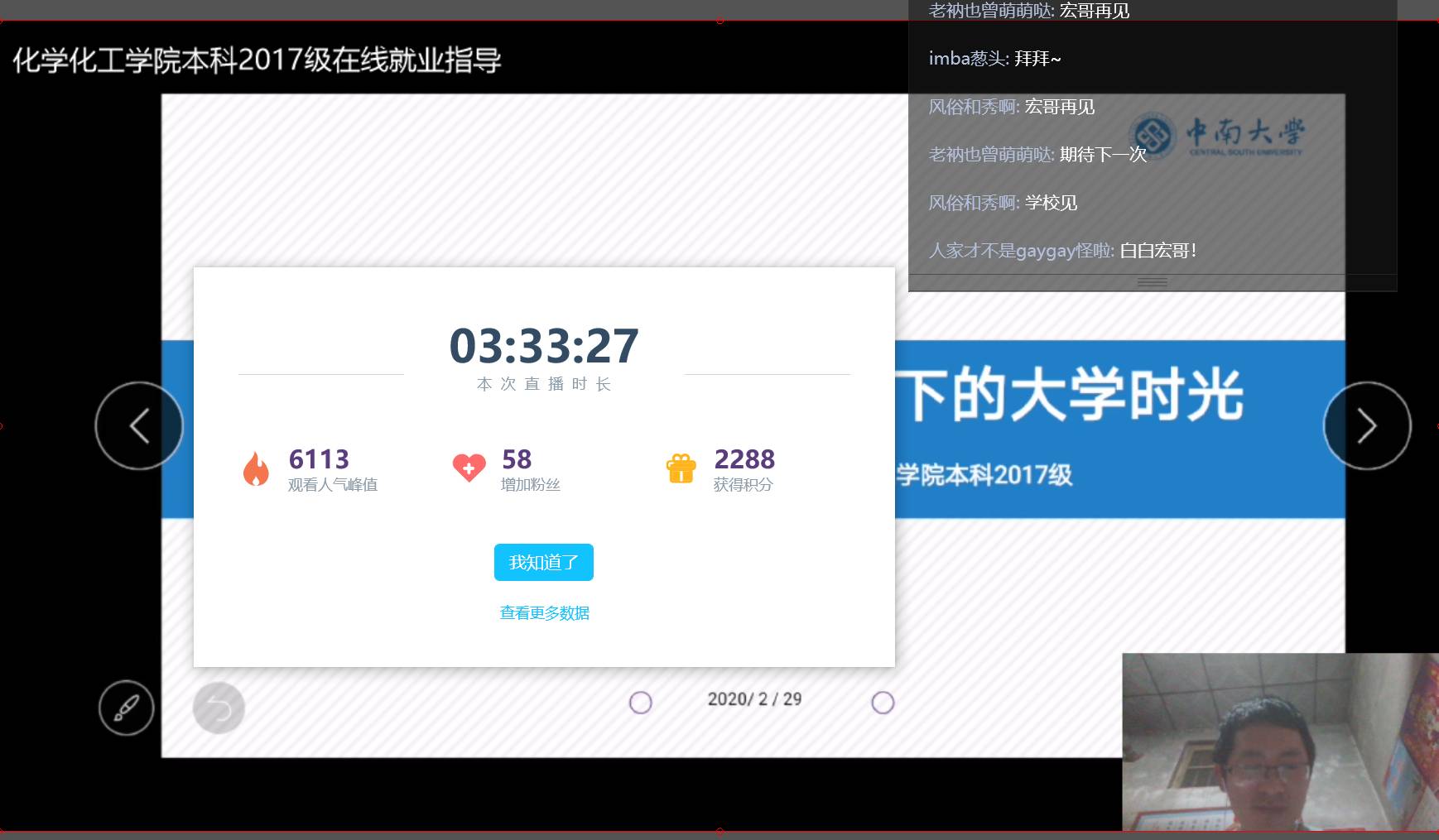 为保证2020年春季学期工作顺利开展,帮助员工顺利过渡到学习状态,做好居家学习生活安排、职业生涯规划以及简历制作等方面内容,2月29日晚,伟德victor1946官网登录年级大会在bilibili直播间举行,年级大会由辅导员刘世宏主持。会上,294名同学及部分员工家长与支持人一起,就后期学习安排、疫情防控、新学期相关重点工作安排、个人发展规划以及简历制作等等进行了线上交流。