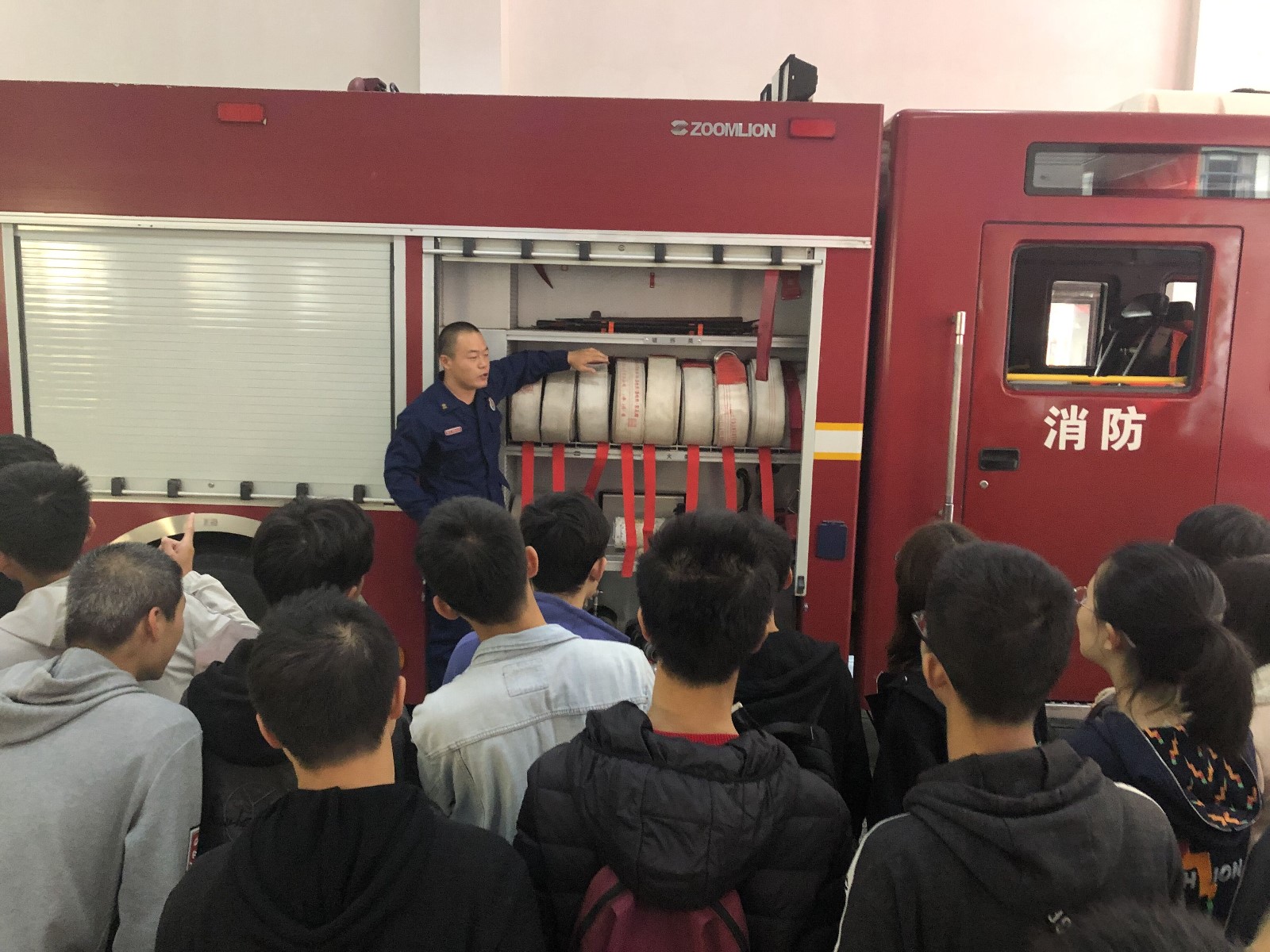 活动伊始,王班长展示了三种消防车所配有的装备,不同种消防车用于不同类型的事故,并为大家介绍了各种装备的用途及其使用方法,让同学们对于消防车有了大概的了解。紧接着,王班长带领我们见识了消防车高空灭火的情形,并随后将活动推入高潮,从没有使用过灭火器的同学们在王班长的带领下依次使用干粉灭火器进行灭火,让同学们基本掌握了灭火器的使用方法。