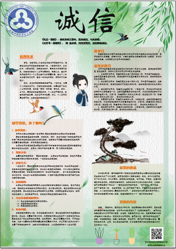 展板内容从诚信先进事迹到道德失信案例,从国家助学贷款、资助体系政策到个人征信小常识,从权利到义务,从社会现象到日常生活,全面覆盖老员工生活所能触及的征信体系。