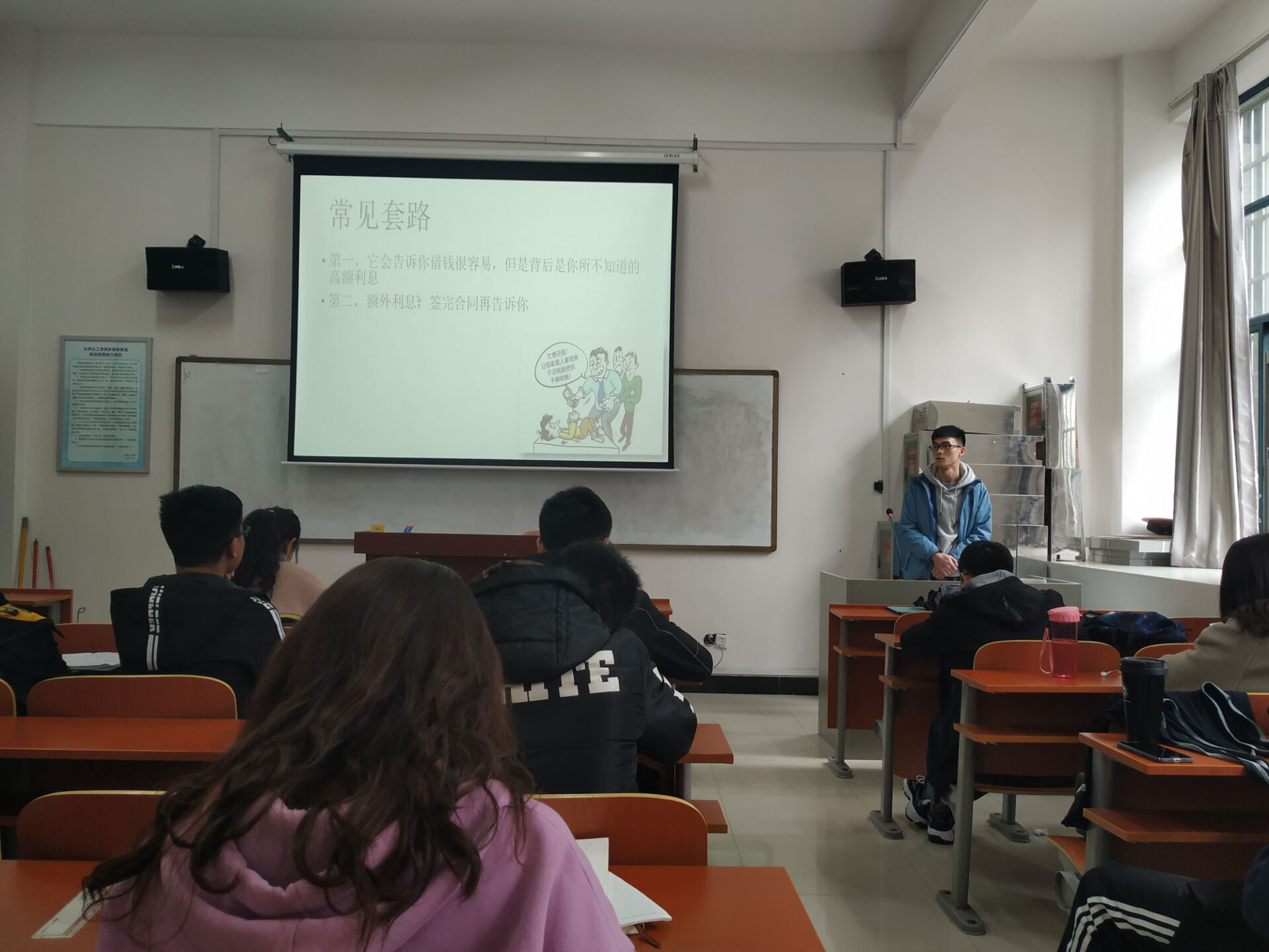 3月15日下午2点半,为提高同学们防骗意识,化工1601班于化学楼123召开了“走遍千山万水,防骗不曾后悔”主题班会,副班长郭龙帅主持。