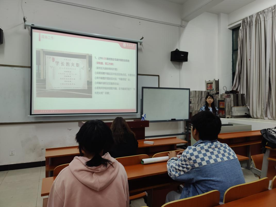 最后,胡雨琪老师根据往年活动情况,再次强调了工作细节,如服装、时间协调、书籍登记、书籍运输等问题,动员大家能够积极主动投身到活动之中,同时也祝愿本次活动能够顺利开展。