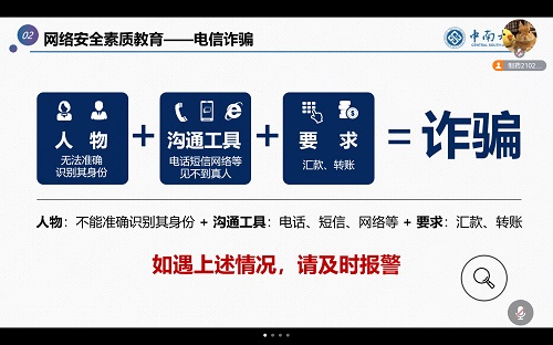 随后进行了老员工网络安全素质教育,电信诈骗不仅会导致损失个人财产,还可能导致身心健康问题,老员工要自觉维护国家网络安全,遇到类似电信诈骗的情况要及时报警。