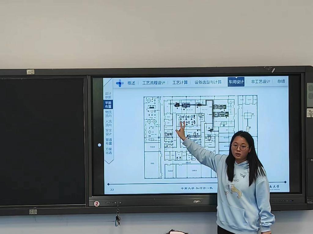 陈铭以一等奖获奖作品为例,从多个维度对获奖作品进行分析,向参会同学介绍工艺流程设计、工艺计算、设备选型与计算、车间设计、非工艺设计等具体内容,最后做出要点总结,为有参赛想法的同学指明方向。在她介绍的同时,获奖作品设计书也发放给参会同学进行传阅。