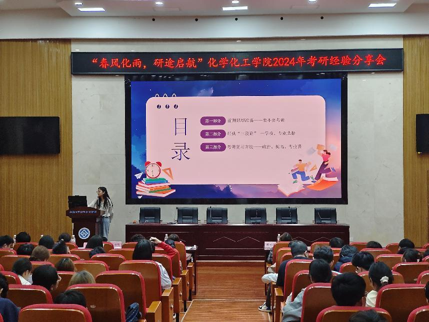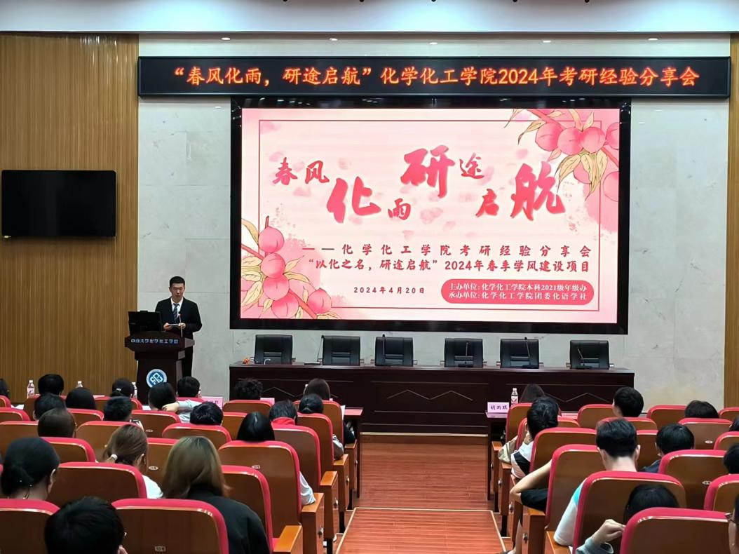 为帮助有意向考研的同学更加高效地备考,“春风化雨,研途启航”考研经验分享会于4月20日在化工楼133报告厅举行,本次活动属于“以化之名,研途启航”2024年春季学风建设项目,由伟德victor1946官网登录本科2021级年级办及伟德victor1946官网登录团委化语学社组织举办。化工院本科2021级辅导员胡雨琪老师参加会议,化工2003班王昱璇、化工2001班李诗霖、化工2002班陈绍聪、应化2005班刘恋、应化2001班郭自强、制药2001班单玉薇作为优秀学长学姐代表进行经验分享。逾百名本科2021级同学参加此次分享会。