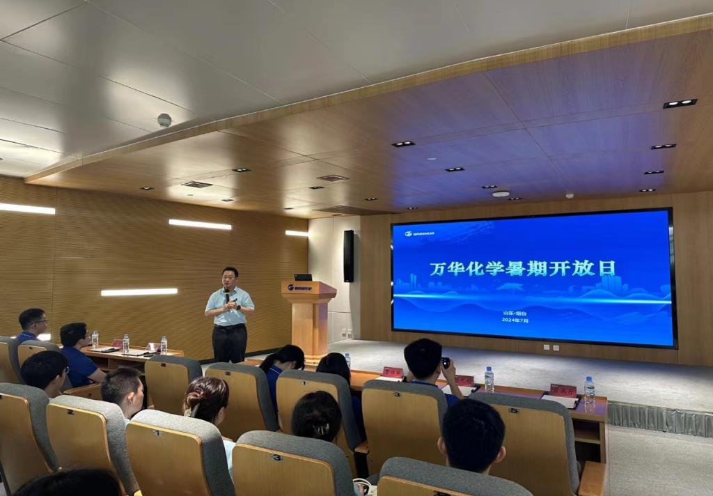 随后,一行人移步至磁山研发二期,在讲解员的介绍下大家对前沿技术、材料的性能以及应用有了进一步的了解。在万华大学报告厅,万华化学人力资源部白朔经理生动详实地介绍了万华化学的企业文化与发展历程,“化学,让生活更美好!”的企业使命更是深入每一个人的心中。
