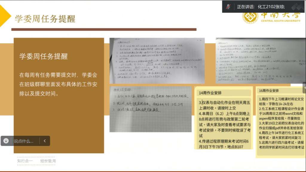 年级长述职后,各班长进行述职,各班班长对本班学习情况、重点员工情况、班级个人规划、大四班委换届摸底等方面进行分析,同时进行未来展望。为了帮助同学们大四顺利毕业,化工2102班开展学委周任务提醒,学委将每周需要上交的作业、需要完成的任务等在班级群中发通知提醒,以防同学们因作业忘交等情况而挂科,对其他班级具有借鉴意义。同时,辅导员关心各班班委换届进展,根据各班情况提出指导意见。