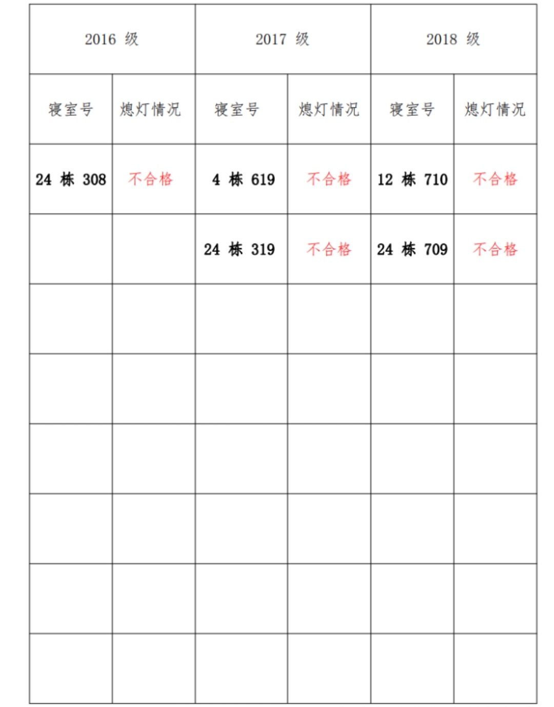 为改正各种不良现象和陋习,增强宿舍学习氛围,营造温馨家园氛围,化学化工公司员工会生活部对三个年级所有寝室进行熄灯检查。本次熄灯情况通报不合格寝室 5 间,具体情况如下: