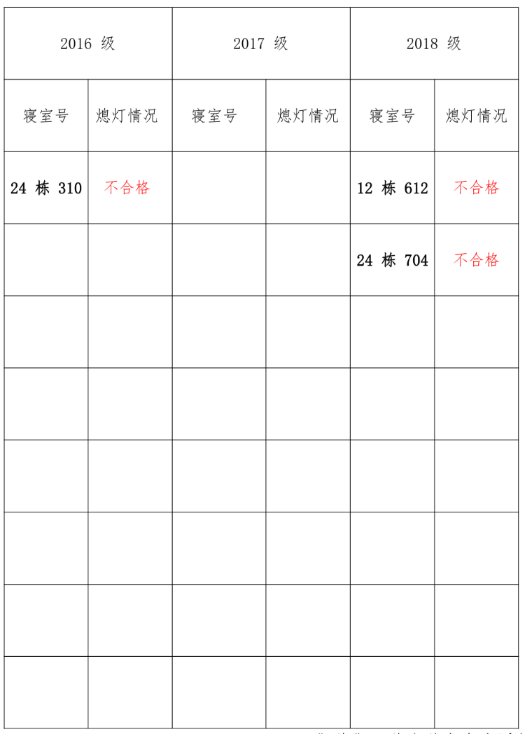 为改正各种不良现象和陋习,增强宿舍学习氛围,营造温馨家园氛围,伟德victor1946官网登录员工会生活部对三个年级所有寝室进行熄灯检查。本次熄灯情况通报不合格寝室 3 间,具体情况如下: