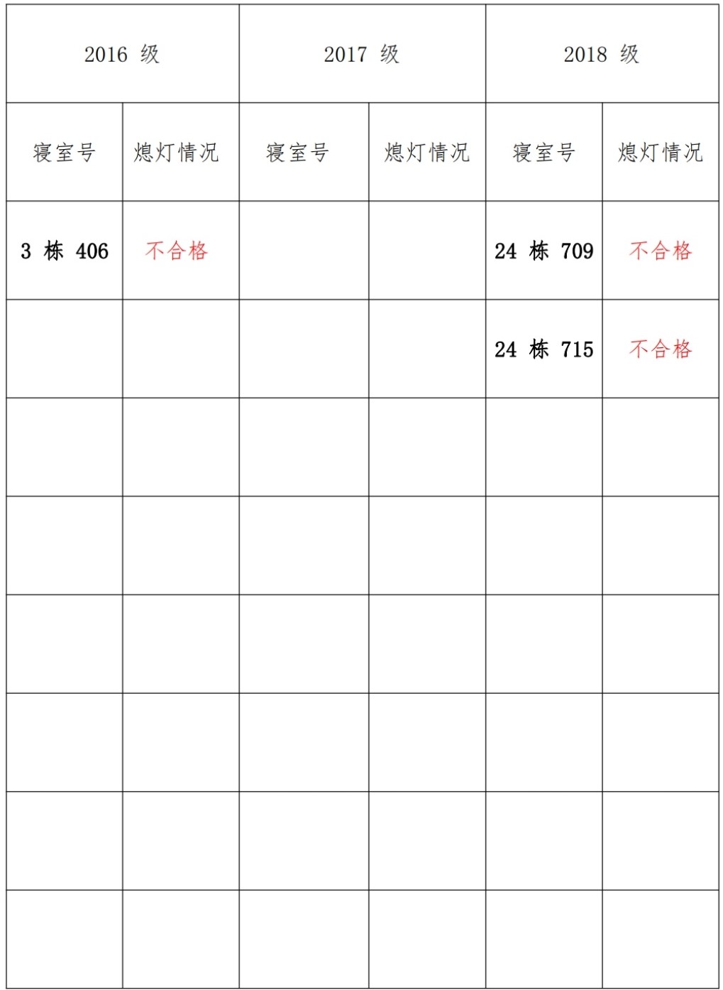 为改正各种不良现象和陋习,增强宿舍学习氛围,营造温馨家园氛围,化学化工公司员工会生活部对三个年级所有寝室进行熄灯检查。本次熄灯情况通报不合格寝室 3 间,具体情况如下: