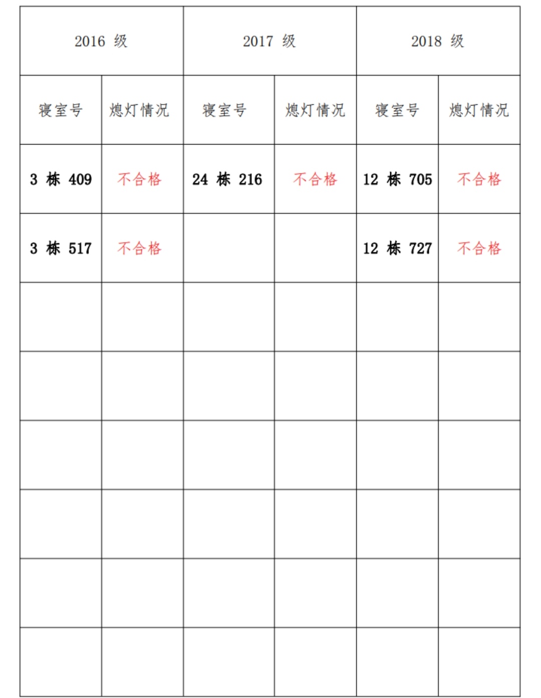 为改正各种不良现象和陋习,增强宿舍学习氛围,营造温馨家园氛围,化学化工公司员工会生活部对三个年级所有寝室进行熄灯检查。本次熄灯情况通报不合格寝室 5 间,具体情况如下: