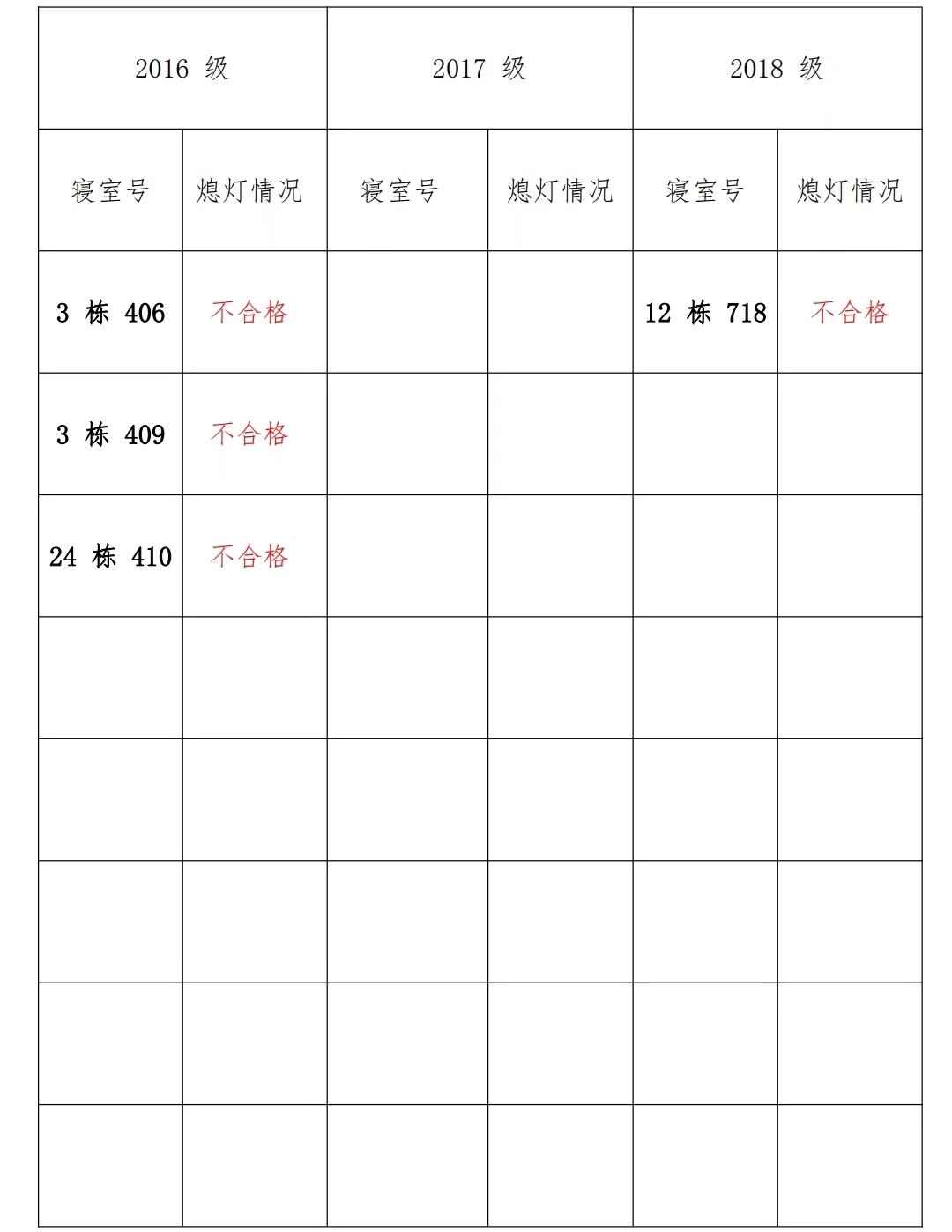 为改正各种不良现象和陋习,增强宿舍学习氛围,营造温馨家园氛围,伟德victor1946官网登录员工会生活部对三个年级所有寝室进行熄灯检查。本次熄灯情况通报不合格寝室 4 间,具体情况如下: