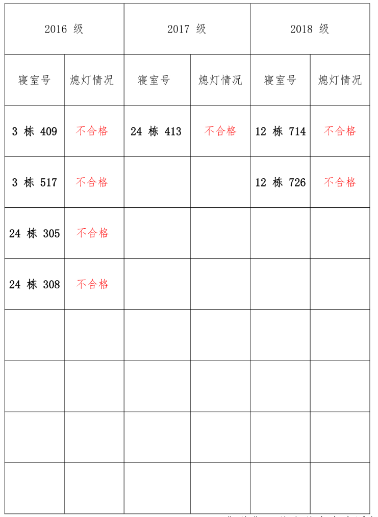 为改正各种不良现象和陋习,增强宿舍学习氛围,营造温馨家园氛围,化 学化工公司员工会生活部对三个年级所有寝室进行熄灯检查。本次熄灯情况通 报不合格寝室 7 间,具体情况如下: