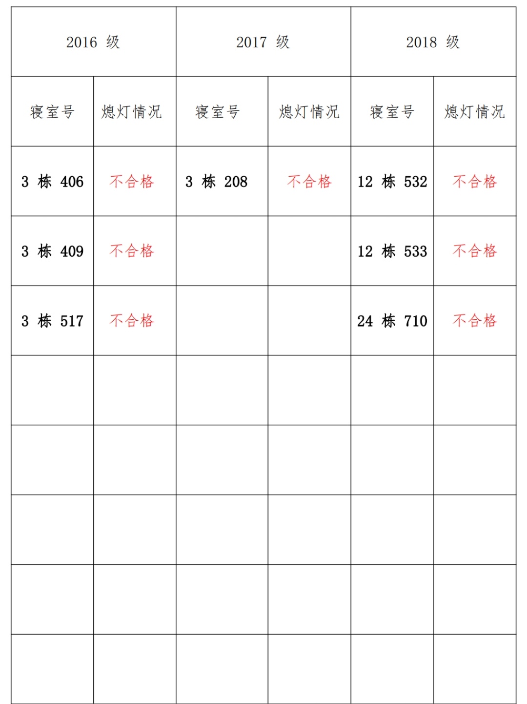 为改正各种不良现象和陋习,增强宿舍学习氛围,营造温馨家园氛围,伟德victor1946官网登录员工会生活部对三个年级所有寝室进行熄灯检查。本次熄灯情况通报不合格寝室 7 间,具体情况如下: