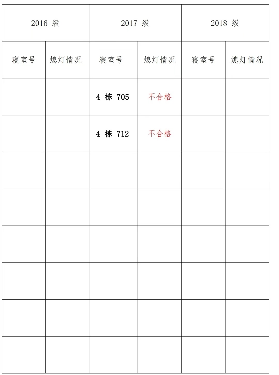 为改正各种不良现象和陋习,增强宿舍学习氛围,营造温馨家园氛围,伟德victor1946官网登录员工会生活部对三个年级所有寝室进行熄灯检查。本次熄灯情况通报不合格寝室 2 间,具体情况如下: