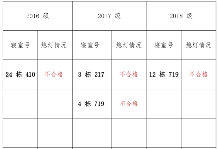 为改正各种不良现象和陋习,增强宿舍学习氛围,营造温馨家园氛围,化 学化工公司员工会生活部对三个年级所有寝室进行熄灯检查。本次熄灯情况通 报不合格寝室 4 间,具体情况如下: