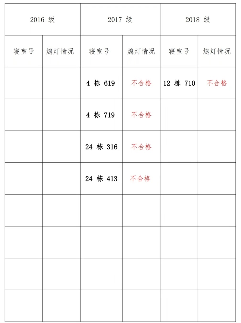 为改正各种不良现象和陋习,增强宿舍学习氛围,营造温馨家园氛围,伟德victor1946官网登录员工会生活部对三个年级所有寝室进行熄灯检查。本次熄灯情况通报不合格寝室 5 间,具体情况如下: