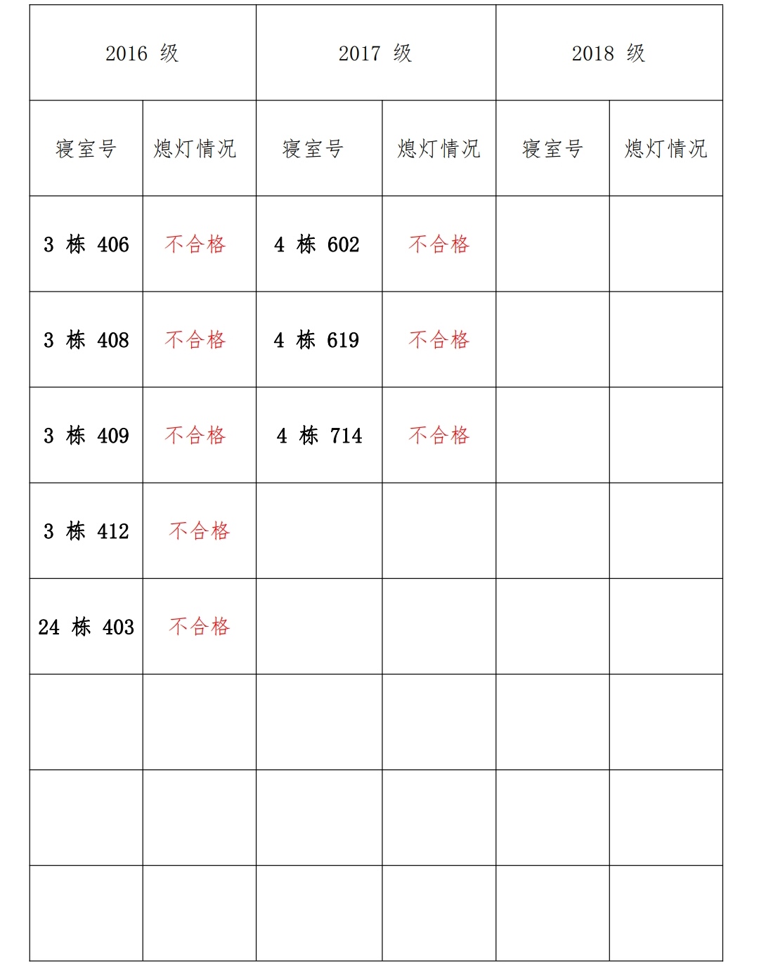 为改正各种不良现象和陋习,增强宿舍学习氛围,营造温馨家园氛围,化 学化工公司员工会生活部对三个年级所有寝室进行熄灯检查。本次熄灯情况通 报不合格寝室 8 间,具体情况如下: