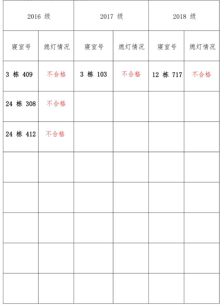 为改正各种不良现象和陋习,增强宿舍学习氛围,营造温馨家园氛围,化 学化工公司员工会生活部对三个年级所有寝室进行熄灯检查。本次熄灯情况通 报不合格寝室 5 间,具体情况如下: