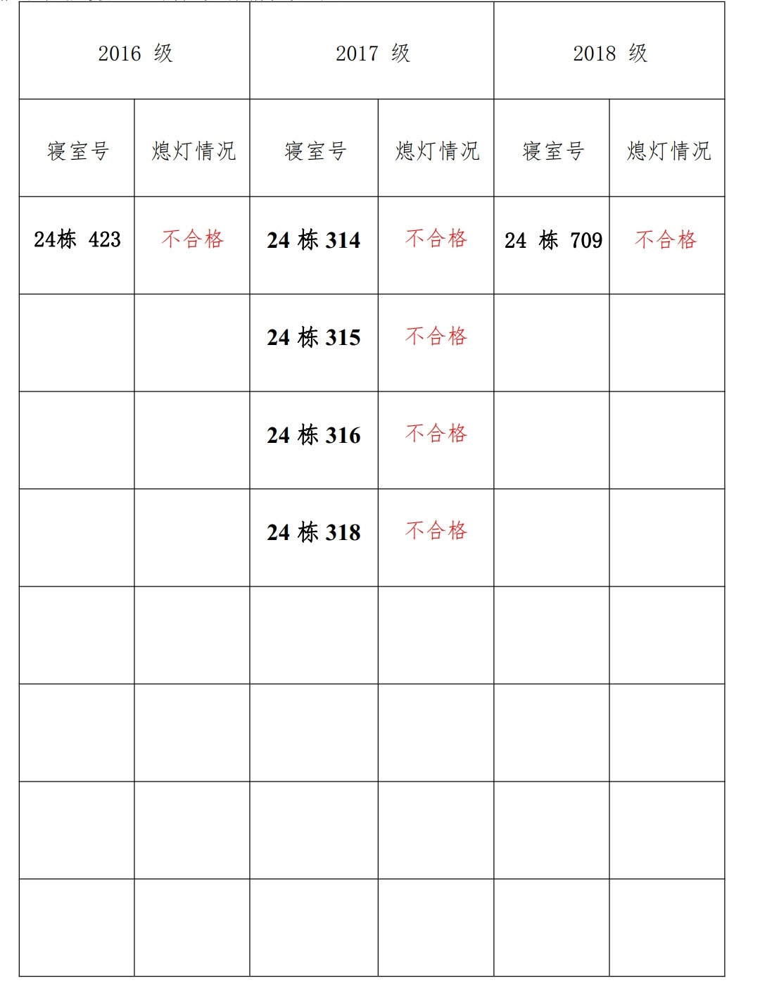 为改正各种不良现象和陋习,增强宿舍学习氛围,营造温馨家园氛围,伟德victor1946官网登录员工会生活部对三个年级所有寝室进行熄灯检查。 本次熄灯情况通报不合格寝室 6 间,具体情况如下: