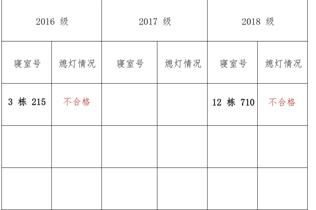 为改正各种不良现象和陋习,增强宿舍学习氛围,营造温馨家园氛围,化学化工公司员工会生活部对三个年级所有寝室进行熄灯检查。本次熄灯情况通报不合格寝室 6 间,具体情况如下: