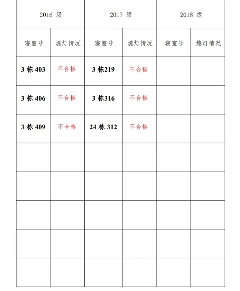 为改正各种不良现象和陋习,增强宿舍学习氛围,营造温馨家园氛围,伟德victor1946官网登录员工会生活部对三个年级所有寝室进行熄灯检查。 本次熄灯情况通报不合格寝室 6 间,具体情况如下: