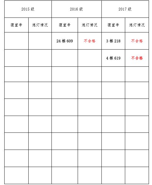 为改正各种不良现象和陋习,增强宿舍学习氛围,营造温馨家园氛围,伟德victor1946官网登录员工会生活部对三个年级所有寝室进行熄灯检查。 本次熄灯情况通报不合格寝室 3 间,具体情况如下: