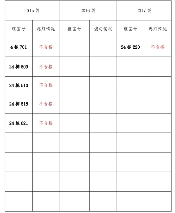为改正各种不良现象和陋习,增强宿舍学习氛围,营造温馨家园氛围,伟德victor1946官网登录团委员工会生活权益服务部对三个年级所有寝室进行熄灯检查。本次熄灯情况通报不合格寝室6间,具体情况如下: