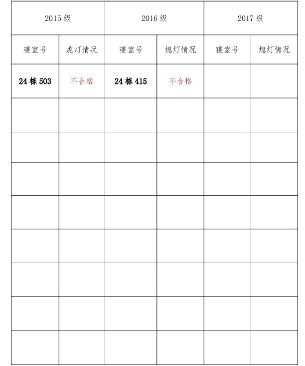 为改正各种不良现象和陋习,增强宿舍学习氛围,营造温馨家园氛围,伟德victor1946官网登录团委员工会生活权益服务部对三个年级所有寝室进行熄灯检查。本次熄灯情况通报不合格寝室2间,具体情况如下: