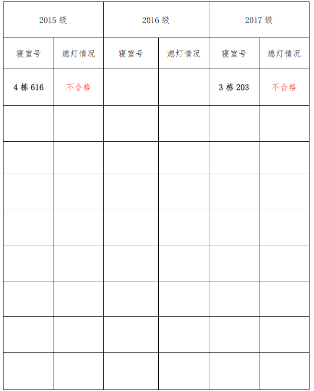 为改正各种不良现象和陋习,增强宿舍学习氛围,营造温馨家园氛围,伟德victor1946官网登录团委员工会生活权益服务部对三个年级所有寝室进行熄灯检查。本次熄灯情况通报不合格寝室2间,具体情况如下: