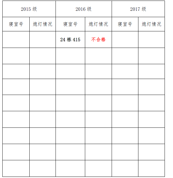 为改正各种不良现象和陋习,增强宿舍学习氛围,营造温馨家园氛围,伟德victor1946官网登录团委员工会生活权益服务部对三个年级所有寝室进行熄灯检查。本次熄灯情况通报不合格寝室1间,具体情况如下: